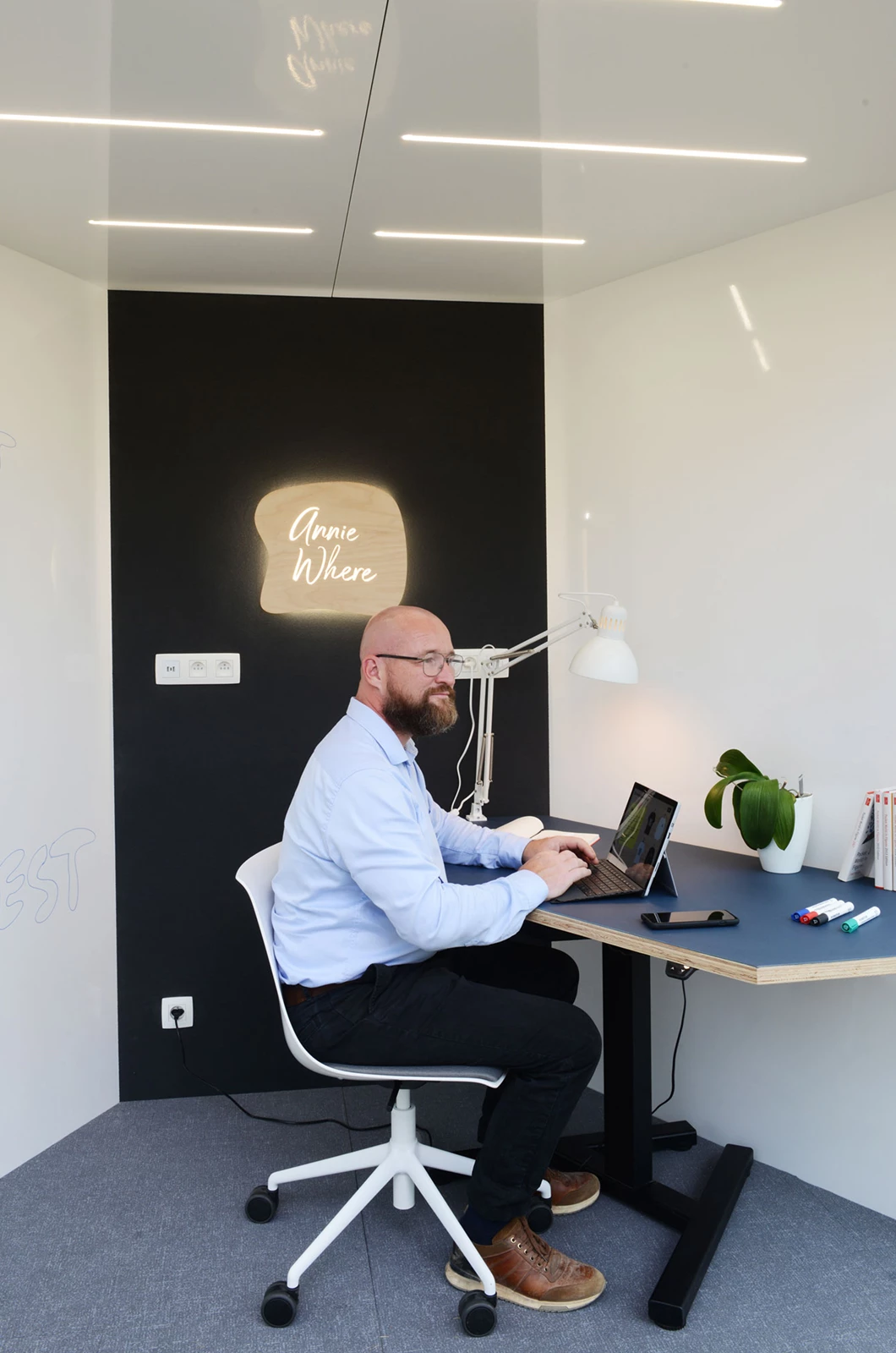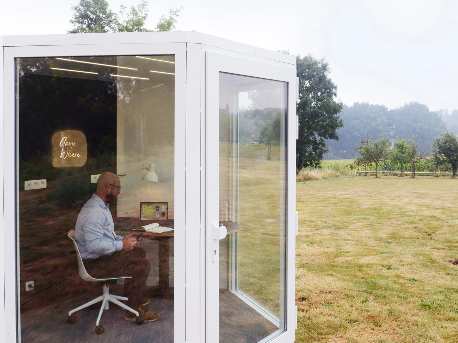 Met deze pod krijgt het begrip 'tuinwerker' meteen een nieuwe invulling. Doordat de pod nagenoeg volledig uit glazen wanden is opgebouwd, voelt het bijna alsof je in openlucht aan het werk bent. David verwoordt het zo: "Ik heb er alles wat ik nodig heb en heb niet eens het gevoel dat ik er aan een bureau zit. Het enige achtergrondgeluid dat ik hoor, is dat van de vogeltjes. Het is niet alleen rustgevend, maar ook inspirerend om daar te werken.”